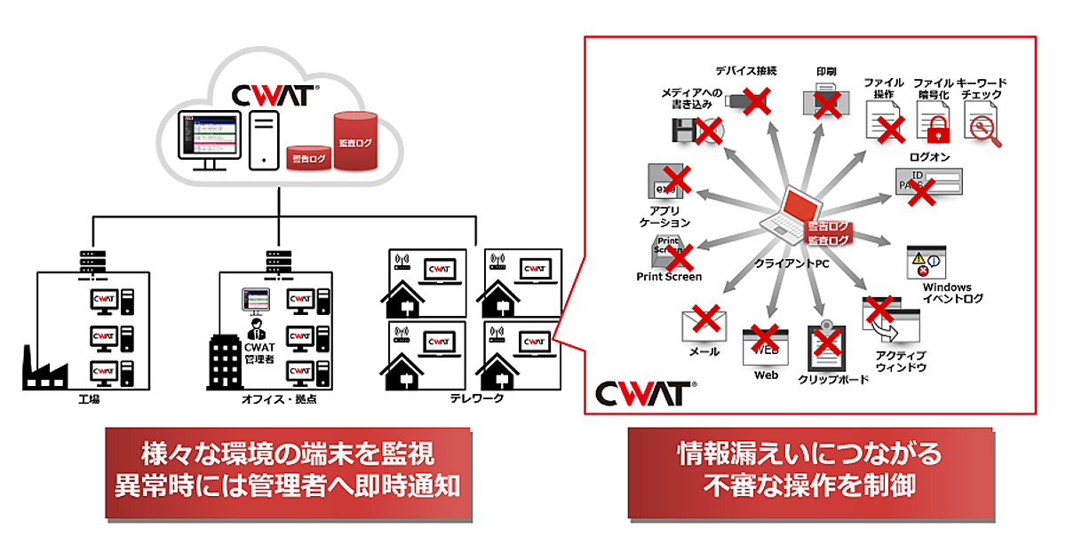 内部情報漏えい対策が企業の課題になっていることが背景。DNPはこれまで、端末で不審な操作があった際に全てのログを調査・分析していたが、CWATクラウドで効率化する。CWATクラウドは、通常の操作ログのほか不審な操作だけ記録するログ機能と、「機密」「社外秘」など特定文字を含むファイルの持ち出しを検出するキーワードチェック機能を備える。
