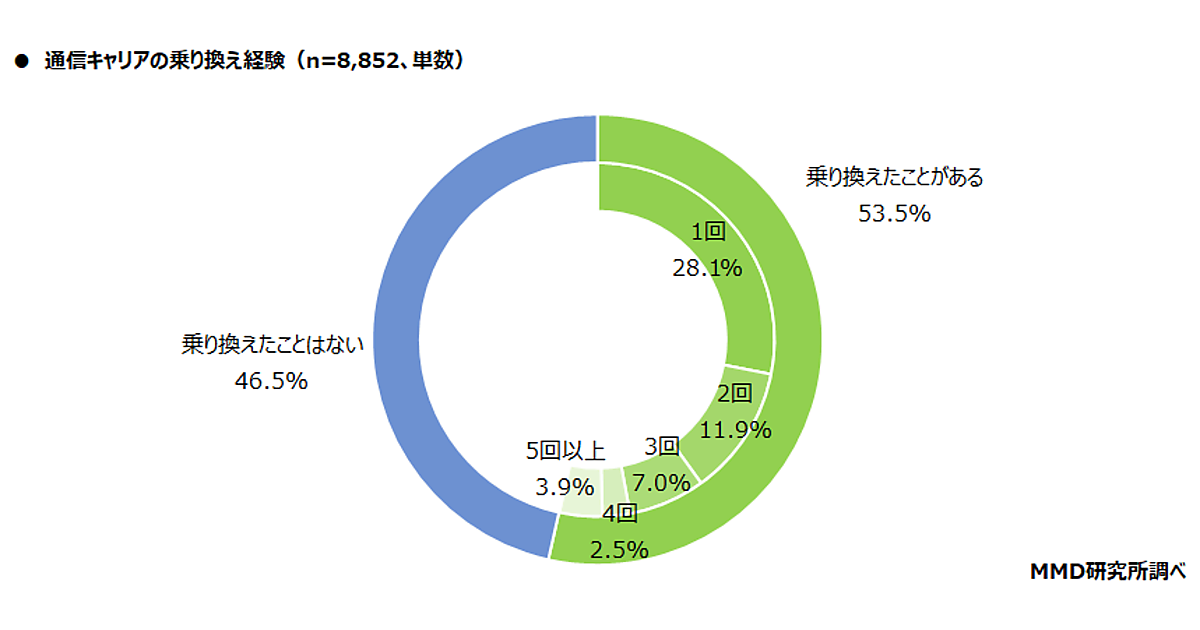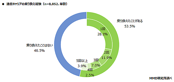 まず「通信キャリアの乗り換え経験」について聞くと、1度でも乗り換えをしたことがある人は53.5%。「1回」28.1%ともっとも多く、「2回」11.9%、「3回」7.0%、「4回」2.5%が続くが、「5回以上」3.9%と反転する。全体では53.5%が乗り換え経験があった。