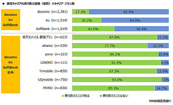 キャリア・プラン別で見ると、「乗り換えたことはない」がもっとも多かったのはdocomoで82.9%。以下au69.8%、SoftBank56.4%が続いた。なおdocomo、au、SoftBankの26.6%が「乗り換えたことがある」とした一方、docomo、au、SoftBank以外では86.9%が「乗り換えたことがある」としている。