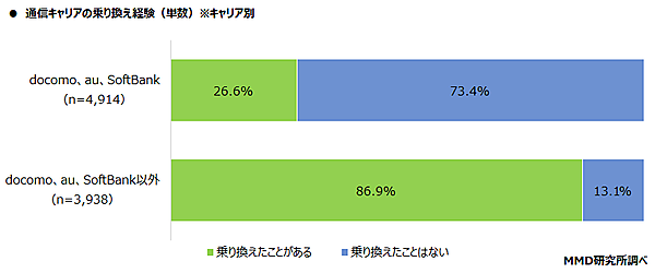 MMDLabo株式会社が運営するMMD研究所は、「通信キャリアの乗り換え経験に関する調査」の結果を発表した。18歳~69歳の全国の男女10,000人が回答している。