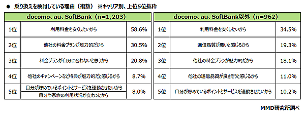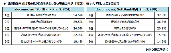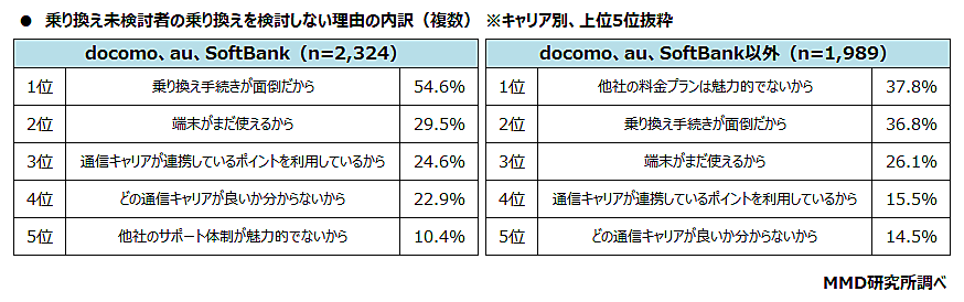 一方、「乗り換えを検討していない」と回答した6,687人にその理由を聞くと、docomo、au、SoftBank(n=2,324)では、「乗り換え手続きが面倒だから」が54.6%と最多。docomo、au、SoftBank以外(n=1,989)は、「他社の料金プランは魅力的でないから」が37.8%が最多だった。