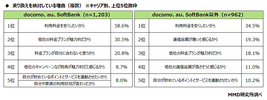 今後の「通信キャリア乗り換え」について聞くと「すぐにでも乗り換えたい」「すぐにではないが、乗り換えを検討している」を合わせ24.5%が検討中だった。乗り換えを検討していると回答した人にその理由を聞くと、「利用料金を安くしたいから」が最も多い。