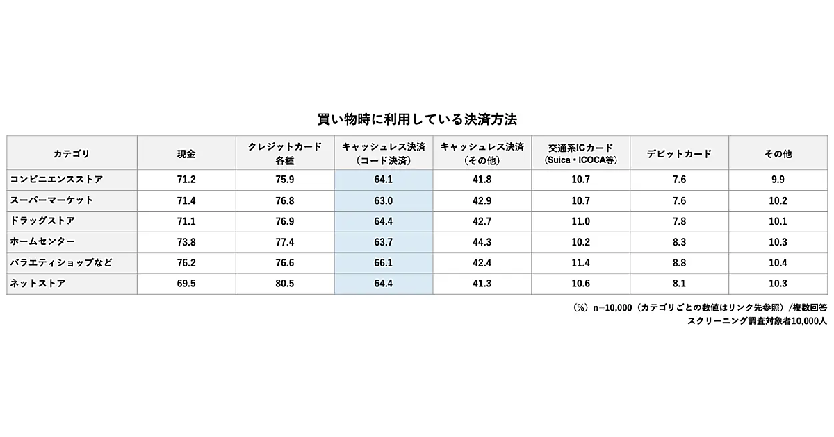 まず、主な決済方法を聞くと、現金やクレジットカードの利用率が引き続き高い一方で、「キャッシュレス決済」の利用が全体で60%を超えていた。
