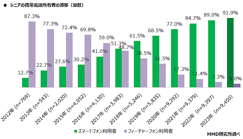 MMDLabo株式会社が運営するMMD研究所は、「2023年シニアのスマートフォン・フィーチャーフォンの利用に関する調査」の結果を発表した。60歳~79歳の全国の男女10,000人が予備調査に回答、スマホメイン利用者500人、スマホ利用検討者358人、スマホ利用未検討者500人が本調査に回答している。