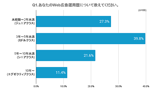 まずマーケティング職、広告・販促職に「Web広告運用歴、および現在の年収」を聞くと、ジュニアクラスで「未経験~2年未満」27.3%、ミドルクラスで「3年~5年未満」39.8%となっており、約7割が「未経験~5年未満」に収まる。
