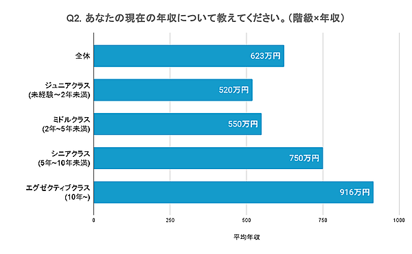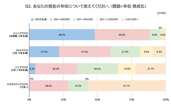 なお今回の調査は、役職をジュニア(未経験~2年)、ミドル(2年~5年)、シニア(5年~10年)、エグゼクティブ(10年以上)の4つのクラスに分類して調査結果をまとめている。