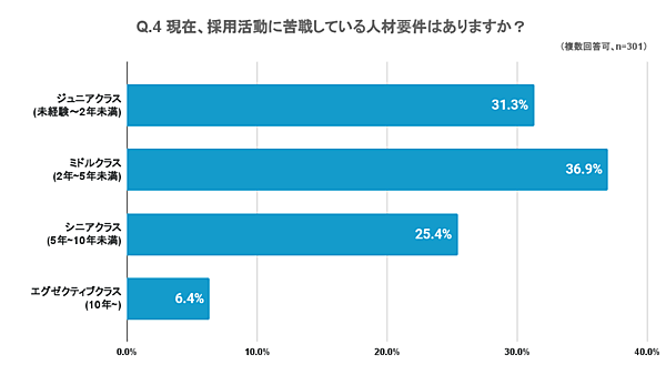 マーケティング職、広告・販促職に加え人事・採用職を含めた301人に「採用したい人材」を聞くと、「ミドルクラス」36.8%ともっとも多く、「シニアクラス」29.8%が続いており、即戦力のニーズが高い。逆に「採用に苦戦している人材」も、「ミドルクラス」36.9%がもっとも多く、獲得競争が激しいようだ。