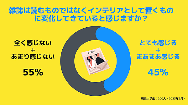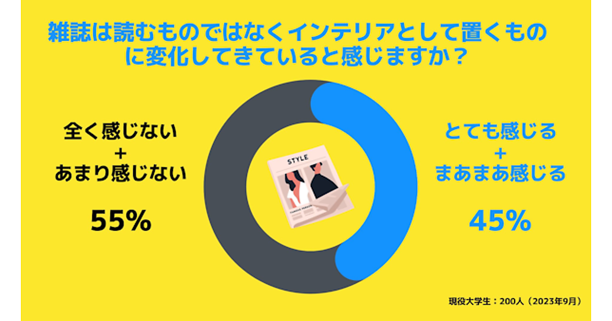 「雑誌は読むモノではなく、インテリアとして置くものに変化してきていると感じますか?」という質問に対して、「とても感じる+まあまあ感じる」は45%。英字新聞やペーパーバックがおしゃれインテリアのように扱われる時代は過去にもあったが、現在の紙の国内雑誌も、すでにメディアから置物になってしまったようだ。