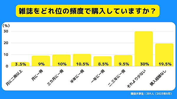 まず「雑誌(紙媒体)をどれくらいの頻度で購入しているか」を聞くと、「月に2冊以上」は3.5%にとどまり、「月に1冊」も9%。一方で、「2、3年に1冊より少ない」30%がもっとも多く、「購入経験なし」は19.5%にのぼる。“雑誌というものを買ったことがない大学生が約2割存在する”ということになる。