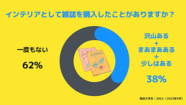 実際に「雑誌をインテリアとして購入したことがあるか」と聞くと、38%が「ある」と回答。具体的な雑誌名としては「NYLON」「Vogue」「POPYE」「anan」「LARME」などがあがった。いわゆるファッション系の雑誌がほとんどで、言論、文芸、映画批評などでないところをどう考えるかは悩むところだ。