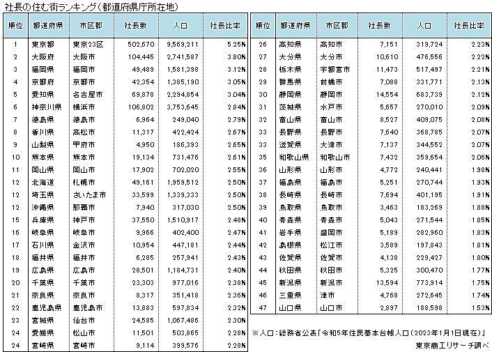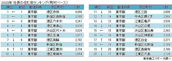 東京商工リサーチ(TSR)は、2023年全国「社長が住む街」に関する調査結果を発表した。同社が保持する企業データベース(約400万社)から、社長の居住地(街=最小単位「町」で「丁目」は区分しない)を抽出しランキングにまとめている。