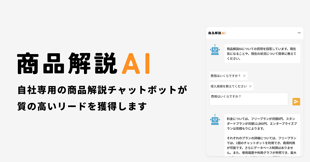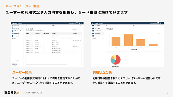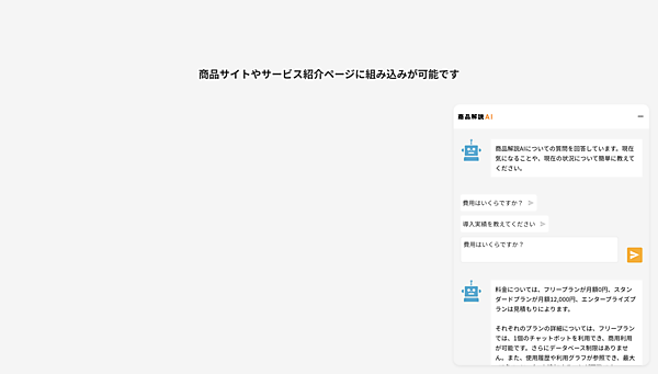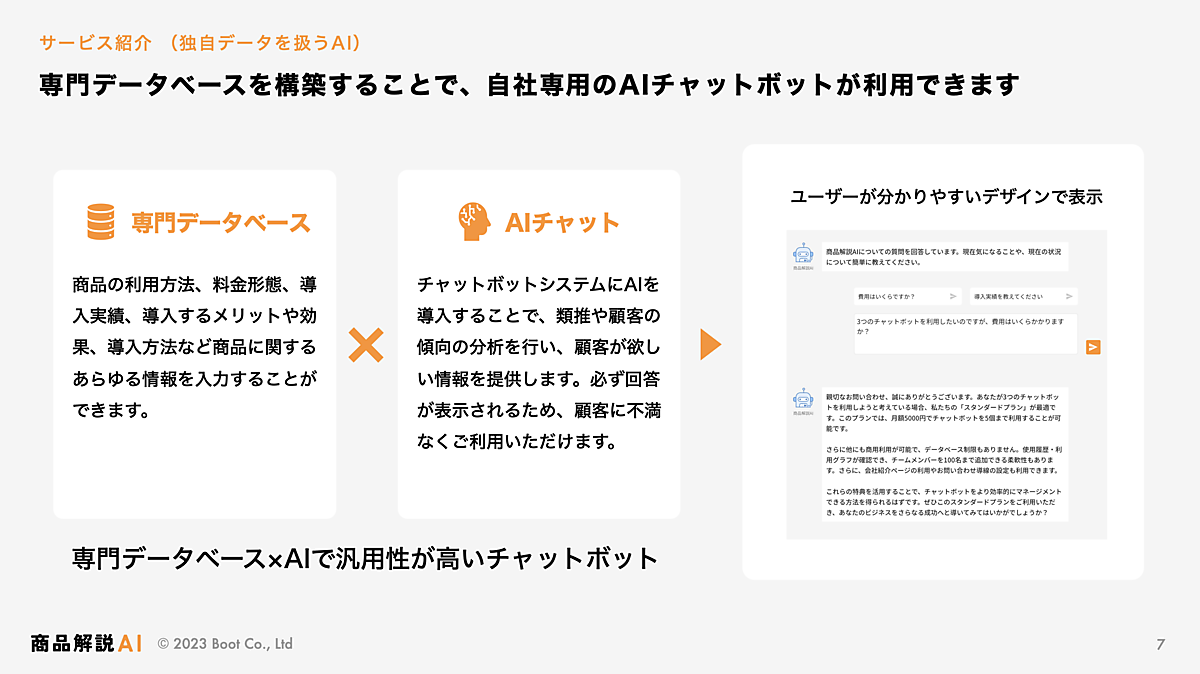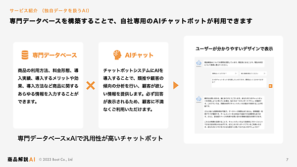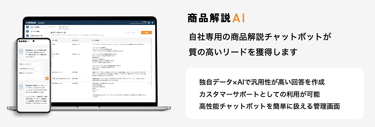 AIと専門データベースでオリジナル回答を出す。商品独自の情報をデータベースに加えるとAIがそのデータを使って答え、不足分がある場合にデータベースの追加や編集をすると即時に反映される。チャットボットにデータを入れるだけで利用でき、1つの商品に1つのチャットボットURLを発行する。ユーザーの入力内容や問い合わせ状況の把握も可能。