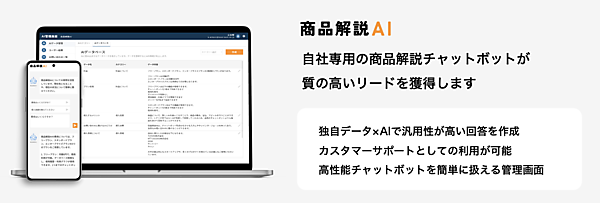 商品の利用法や料金形態などの情報をデータベースに入力しておくと、ユーザーの質問にAIが回答する仕組み。データを入れるほどAIの性能が高まる。質問が入力情報に合致していなくても、計算した数値や関連情報を提供。企業に合った提案や汎用(はんよう)性の高い回答を行う。従来のチャットボットと違い、AIが思考して答えることが特長となる。