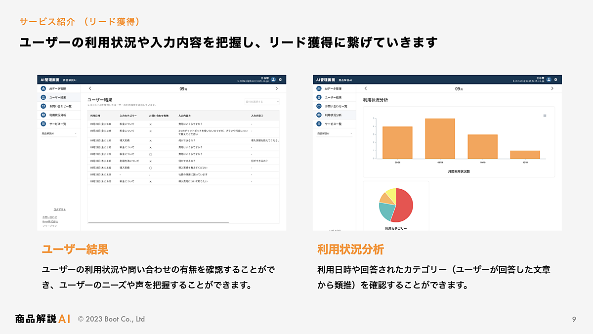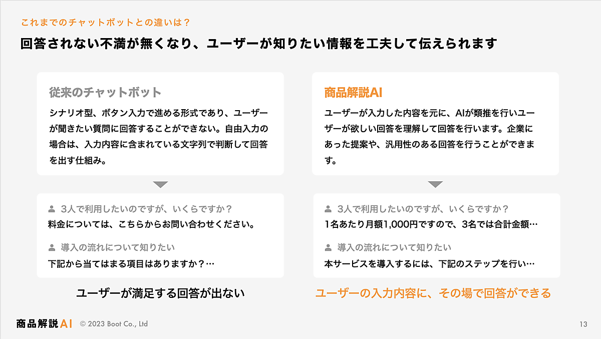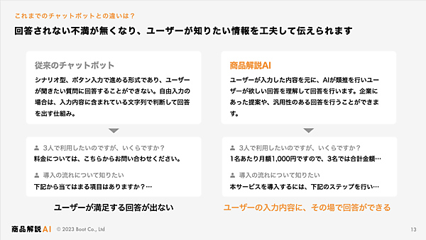 システム受託開発事業のBoot(ブート)は、AI(人工知能)が商品に関する質問に回答する専用チャットボット「商品解説AI」の展開を始める、と10月16日発表した。ユーザーが入力した質問内容を基にAIが類推し、必要とされる情報を理解してその場で回答する。ユーザーが求めている情報を提供することで、質の高い見込み客の獲得が可能になるという。