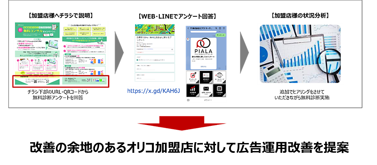 Web広告無料診断サービスは、全国で約85万店あるオリコの加盟店が対象。加盟店にチラシで説明し、ウェブやコミュニケーションアプリ「LINE」で加盟店にアンケートを実施する。アンケートは5分程度で終わる簡易な内容で、ピアラがその結果に基づいて現状を分析。改善余地がある加盟店に対し、広告運用の改善を提案する仕組みとなる。