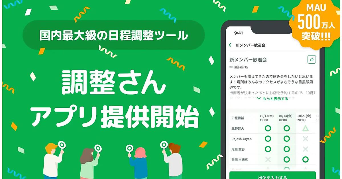 調整さんは歓迎会、送別会、飲み会、同窓会、結婚式の2次会などさまざまな会を開く際に必要な出席者の日程調整・出欠管理作業を容易にするウェブサービス。1カ月のアクティブユーザー数が3月に過去最高の500万人を突破した。リクルートホールディングスが2006年にサービスを始め、ミクステンドが2018年に事業を譲り受けて引き継いだ。