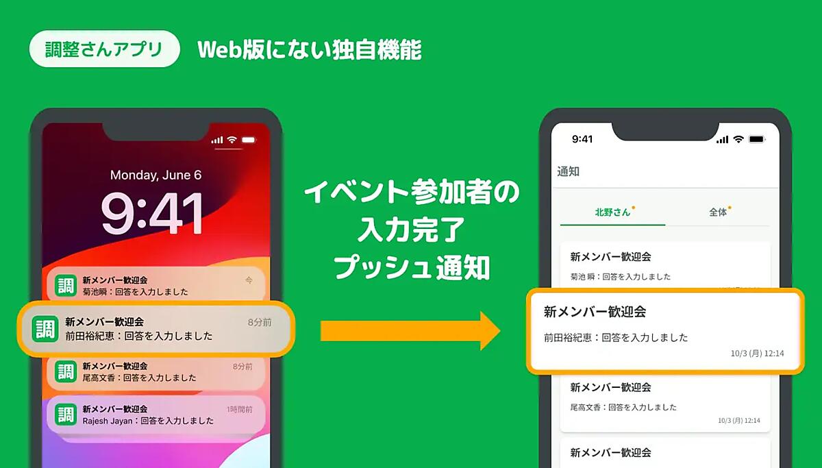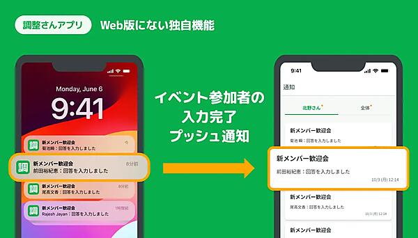 ウェブ版にないアプリの機能は、入力完了プッシュ通知。参加者が日程を入力すると、幹事にプッシュ通知で知らせる機能となり、幹事は参加者が出欠を更新した場合に履歴が確認できる。日程調整は、幹事が催しを作成して参加者に出欠を入力してもらい、全員が入力したら開催日を決める仕組み。アプリは「iOS」と「Android」用を用意した。