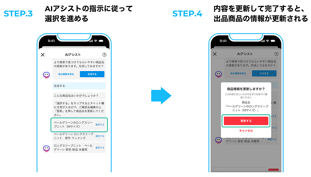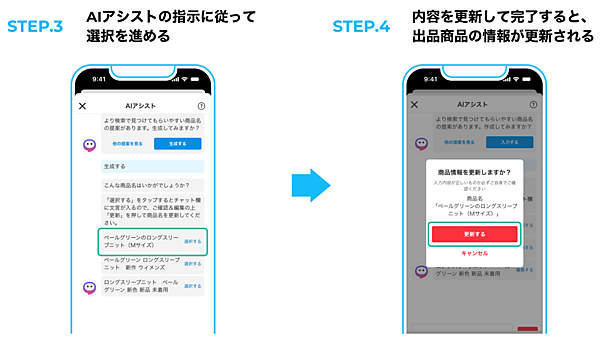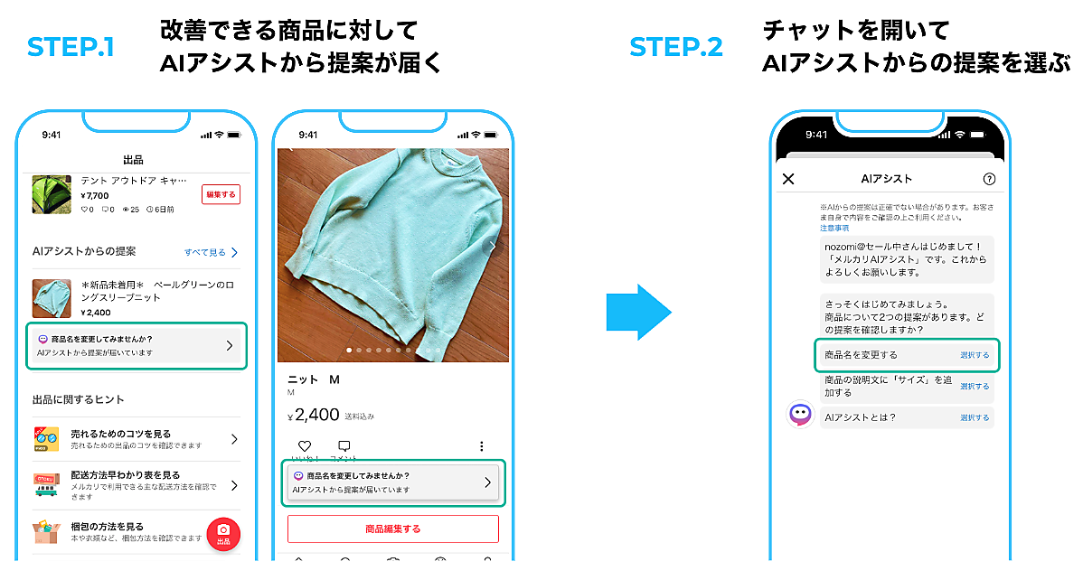 メルカリAIアシストは、出品・購入・その他困ったことの解決など、さまざまな場面でAIが利用者の最適な行動を促す機能。フリマ利用者に見える形での生成AI、LLMのアプリへの実装はこれが初という。出品商品の改善提案機能は、一定期間売れ残っている出品商品に対してメルカリの過去の情報からAIが商品情報の改善を提案する。
