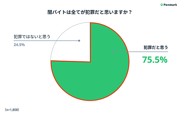 一方で「闇バイトはすべてが犯罪だと思うか」という質問には、75.5%が「犯罪だと思う」とした一方、24.5%は「犯罪ではないと思う」と回答している。ただし警察庁は「闇バイトは犯罪実行者の募集です」としており、「書類を受け取るだけ」といった表面上問題のなさそうな行動でも、犯罪への荷担として扱われる。例外はないと考えていたほうがよいだろう。