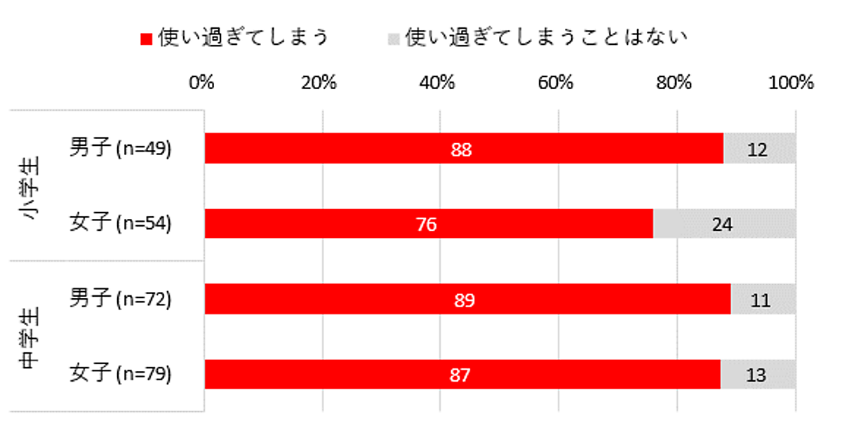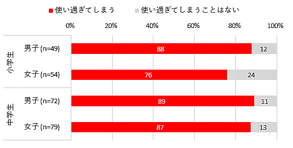 そこで小中学生に「スマホを使い過ぎてしまうことがあるか」と聞くと、小中の男女いずれも7割を超えた。小学生女子の76%が最低だが、それ以外は90%に近く、ややスマホ依存気味のようだ。
