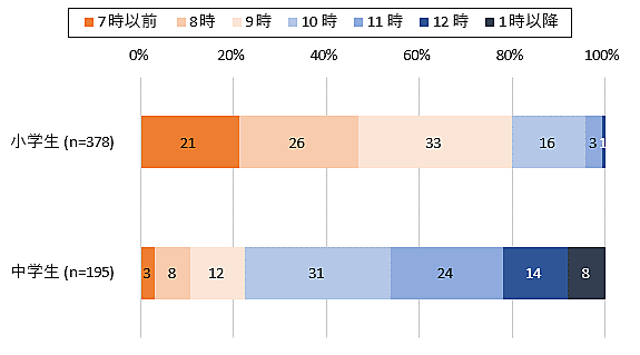 まず各家庭において「小中学生がネットを終了する時刻」を聞くと、小学生の8割が「午後9時まで」にネットを終了していたが、中学生は約2割にとどまった。中学生では「12時」「1時以降」も2割程度存在する。