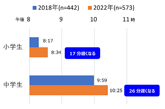 ネット終了時刻の平均を算出すると、小学生は「午後8時34分」、中学生は「午後10時25分」だった。2018年の調査と比較し、小学生で17分、中学生で26分も遅くなっていた。