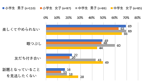 理由については男女・学年問わず、「楽しくてやめられない」が最多。中学生では男女に差が見られ、男子は「暇つぶし」、女子は「友達付き合い」「話題を見逃したくない」が比較的多かった。