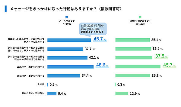 「メッセージを受け取った後の行動」でも、メルマガは「Webで購入・申し込み」45.7%、「Webでクーポンを利用する」48.6%が上位なのに対し、LINEは「Webでクーポンを利用する」45.7%が最多だが、「WebやSNSで検索する」37.5%、「店舗でクーポンを利用する」35.3%と、リアルでのクーポン活用が重視されている。