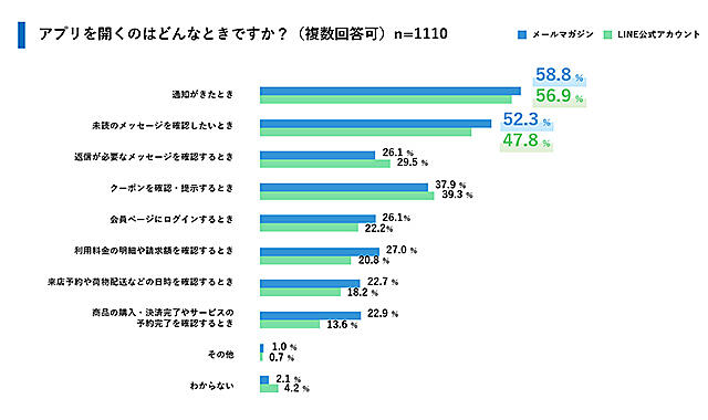 「アプリを開くタイミング」も、「通知がきたとき」が双方とも最多だが、LINEはメルマガに比べて「返信が必要なメッセージを確認するとき」「クーポンの確認・提示」が上回っている。