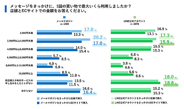 一方で「決済額」については、「ECでの購入」はどの金額帯でもメルマガがLINEを上回る。LINEは「0~6,000円まで」の金額帯でECよりもリアル店舗での購買割合が高い。Webでの行動喚起にはメルマガが、リアル店舗での行動喚起にはLINEが向いていそうだ。