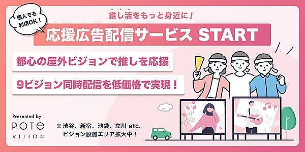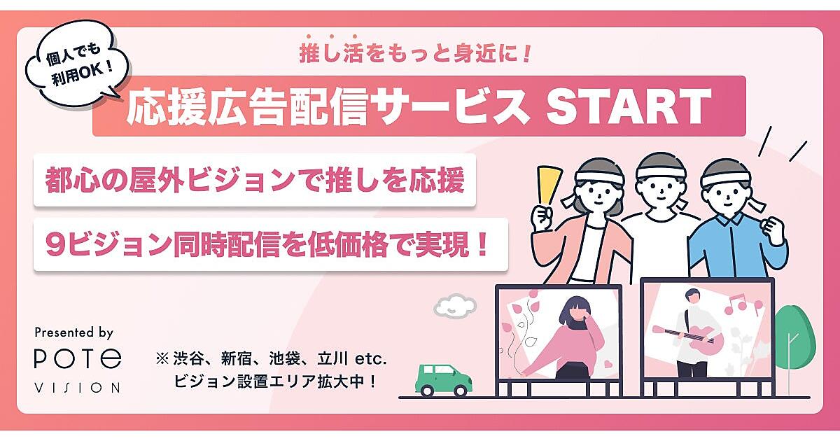 デジタルコンテンツ制作や屋外広告配信サービスなどを手掛けるpote+(ポテト)は、東京都内で展開するデジタル屋外広告サービス「pote vision」で、個人・団体が“推し”の広告が出せる「応援広告配信サービス」を始めた、と10月19日発表した。通常の法人向けプランより低料金でLED(発光ダイオード)ビジョンに広告が表示できる。