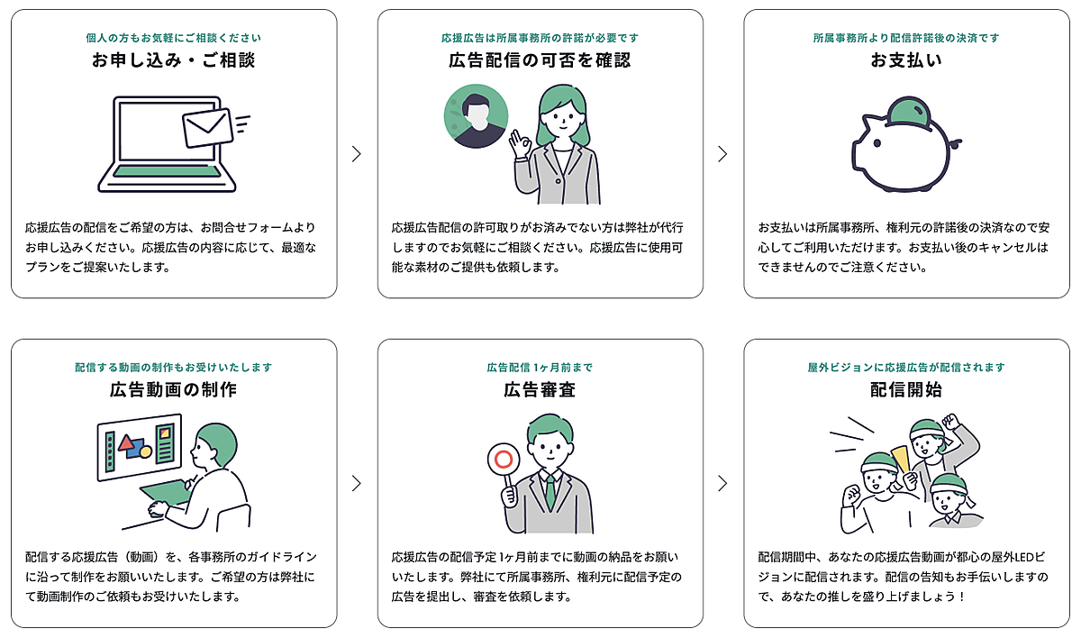 推しは、人や物のファンと、周囲に勧めたい人・物などを指し、有名人やキャラクターに対して使われる場合が多い。応援する消費行動“推し活”が広がっていることから、個人や団体の推し活文化を加速させる取り組みとして応援広告配信サービスを提供する。都内で1週間4万円(税別)からの料金でデジタル屋外広告の利用を可能にした。