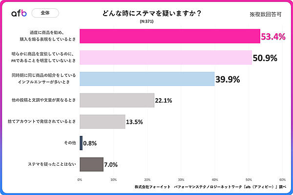 なお「どんなときにステマを疑いますか?」という質問では、「過度に商品を勧め、購入を煽る表現をしているとき」53.4%、「あきらかに商品を宣伝しているのに、PRであることを明言していないとき」50.9%、「同時期に同じ商品の紹介をしているインフルエンサーが多いとき」39.9%が上位だった。
