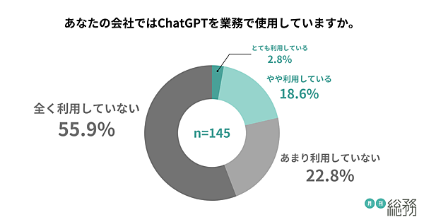 人工知能(AI)の「ChatGPT」について、「自社の業務でChatGPTを使用しているか」を聞くと、「とても利用している」2.8%、「やや利用している」18.6%と、計21.4%が利用中と回答した(145社中31社)。具体的に使用している業務では、「資料・文章の校正」54.8%がもっとも多く、「情報収集」51.6%、「企画・アイデア出し」51.6%が特に多かった。文書作成やカスタマーサポートはまだまだこれからのようだ。