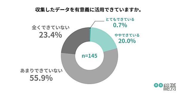 「収集しているデータを有意義に活用できているか」を聞くと、「とてもできている」0.7%、「ややできている」20.0%で、さらに数値が低下した。