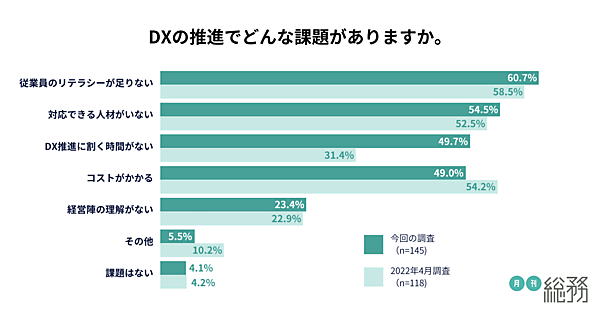 「DX推進における課題」を聞くと、「従業員のリテラシーが足りない」60.7%、「対応できる人材がいない」54.5%と、人材に関する課題が引き続き上位を占めた。また「DX推進に割く時間がない」が前回調査より大幅に増えている。逆に「コストがかかる」という回答は、前回調査より減少を見せた。