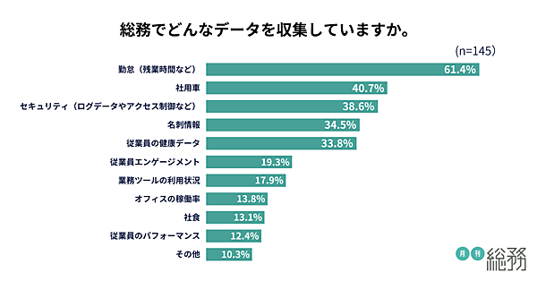 「総務で収集しているデータ」を聞くと、「勤怠(残業時間など)」61.4%でもっとも多く、「社用車」40.7%、「セキュリティ(ログデータやアクセス制御など)」38.6%が上位。