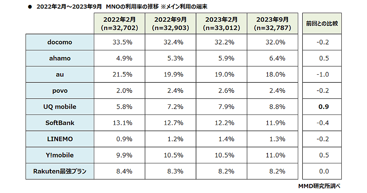 MNOの利用率、「UQ mobile」が0.9ポイント増