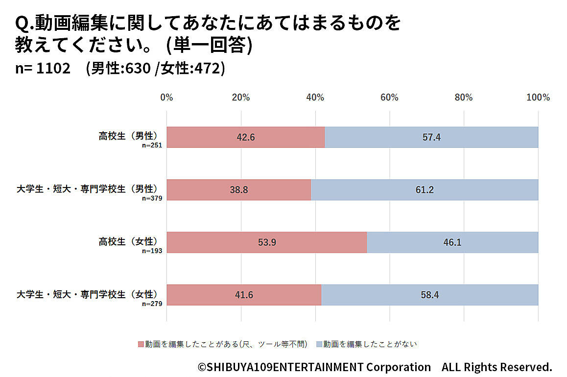 まず「動画編集の経験」を聞くと、女子高校生では動画編集経験者は53.9%、女子高校生以外では約4割が「動画を編集したことがある」と回答した。