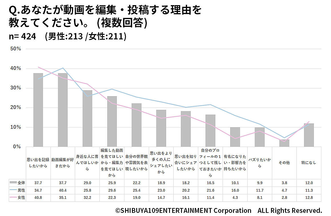 「動画を編集・投稿する理由」では、「思い出を記録したいから」「動画編集が好きだから」37.7%が同率で最多。「身近な人に喜んでほしいから」29.0%がそれに続く。