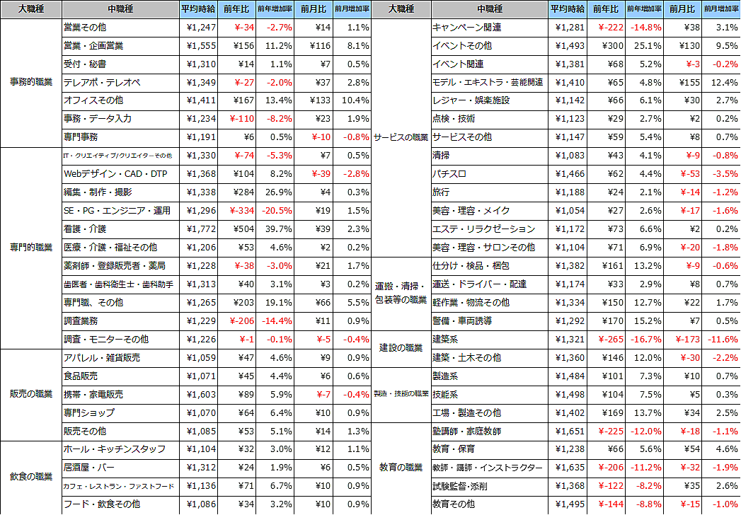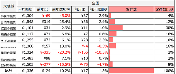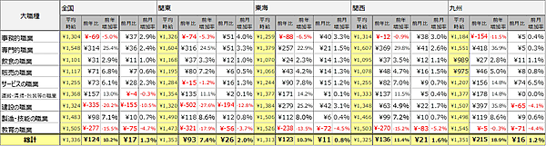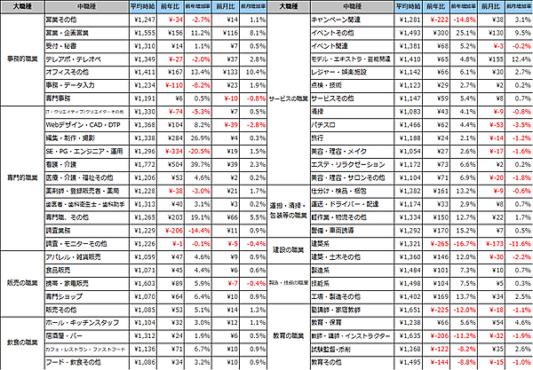 職種別では、9職種中6職種の大カテゴリが前年を上回った。前年を下回ったのは事務的職業、建設の職業、教育の職業の3種。