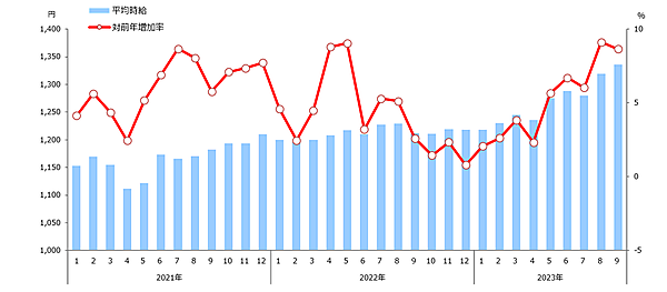 ディップは、2023年9月のアルバイト時給データを発表した。同社が運営する求人情報サイト『バイトル』などに掲載されたデータをもとに集計を行っている。