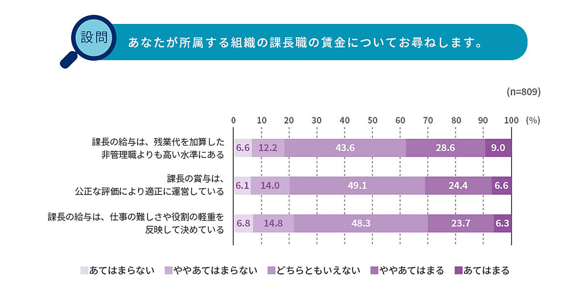 また、課長職の賃金について、「課長の給与は、残業代を加算した非管理職よりも高い水準にある」という項目に肯定的な回答をした人は合計で37.6%。一方で、18.6%の人は残業代を加算した非管理職よりも給与が低い水準にあることがわかった。