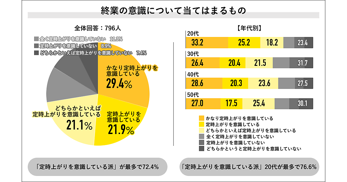 まず「終業に対する意識(定時で仕事を終えているか)」を聞くと、「定時上がりを意識している派」72.4%が大多数で、「かなり意識している」29.4%、「意識している」21.9%、「どちらかといえば意識している」21.1%と内訳がわかれた。年代別では20代の76.6%が最多だが、それに40代(72.5%)が続く。30代は68.3%と最も少なかった。