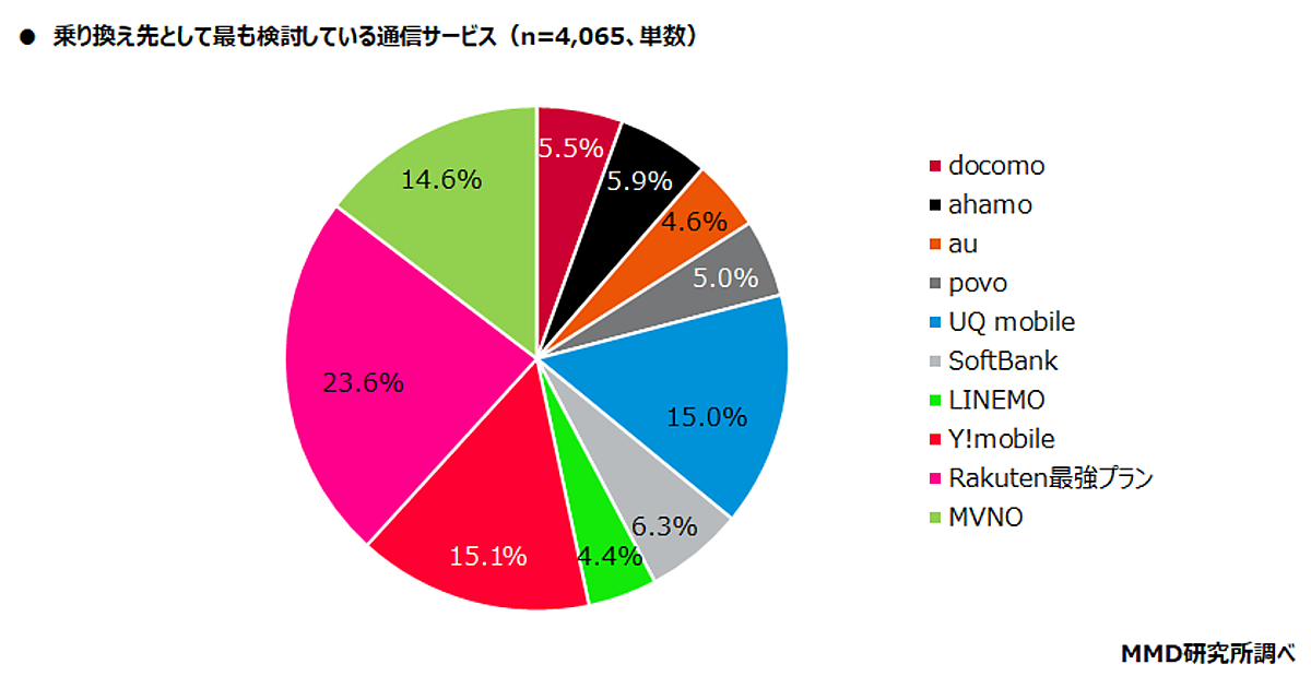 乗り換え先として最も検討している通信サービスは「Rakuten最強プラン」が23.6%でトップに。2位は「Y!mobile」で15.1%、3位は「UQ mobile」で15.0%となった。