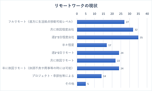 まず「リモートワークの現状」について聞くと、「週1~2日程度出社」35人がもっとも多く、「月に数回程度出社」32人、「フルリモート」27人が上位となり、多くのエンジニアがリモートワークを実施しており、「半々程度」を含めると過半数のエンジニアがリモートワーカーだった。