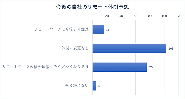 「今後の自社のリモートワーク」については、「体制に変更なし」103人が最多だが、40%近い76人が「リモートワークの機会は減りそう/なくなりそう」と予想していた。