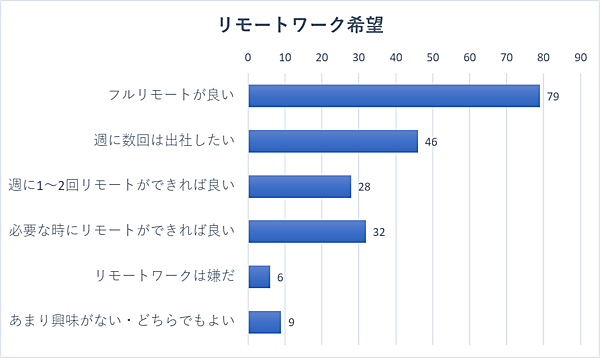 一方エンジニア自身の「リモートワークへの希望」を聞くと、もっとも多かったのは「フルリモート」79人で、「週に数回は出社したい」46人と、リモート指向が強い。エンジニアの多くは自宅でもフル業務が可能なことが多いためと考えられる。