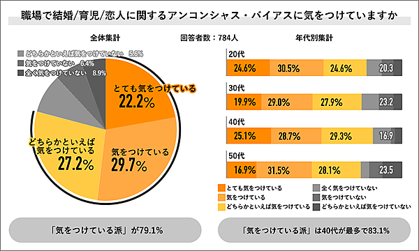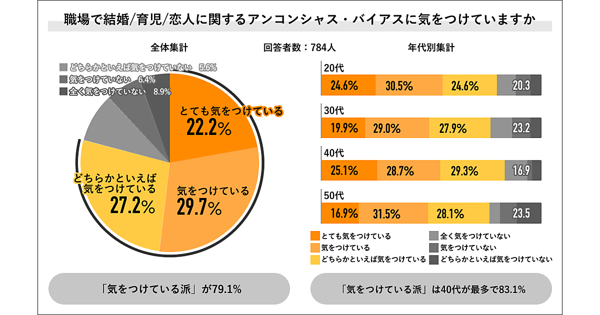 まず「“結婚・育児・恋人”に関して職場でアンコンシャス・バイアスに気をつけているか」を聞くと、「気をつけている派」79.1%が多数(とても気をつけている22.2%、気をつけている29.7%、どちらかといえば気をつけている27.2%)。年代別では40代の「気をつけている派」83.1%が最多。20代79.7%、30代76.8%、50代76.5%がそれに続くなど、働き盛り層と壮年層で低いようだ。