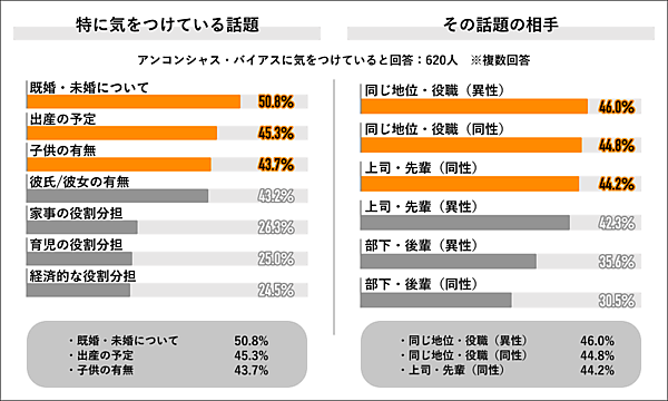 気をつけていると回答した620人に「特に気をつけている話題」を聞くと「既婚・未婚について」50.8%、「出産の予定」45.3%、「子供の有無」43.7%が上位。「それらの話題に気を付けている相手」を聞くと、「異性の同じ地位/役職」46.0%、「同性の同じ地位/役職」44.8%、「同性の上司/先輩」44.2%が上位。“異性の同僚”に特に注意を払っているようだ。こうしたアンコンシャス・バイアスな言動に対しては「意見を押し付けられている気分になる」「否定されている気分になる」という人が多く、相手に対する印象が下がりがちだ。